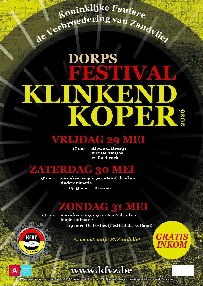 Het weekend van 29, 30 en 31 mei 2026 verwelkomen we je in Zandvliet op de 5de editie van Klinkend Koper! Met veel muziek, kinderanimatie, lekker eten & drinken en ons  terras wordt het weer volop genieten.